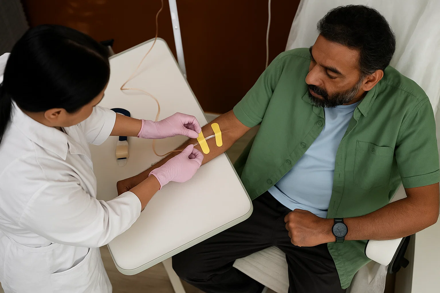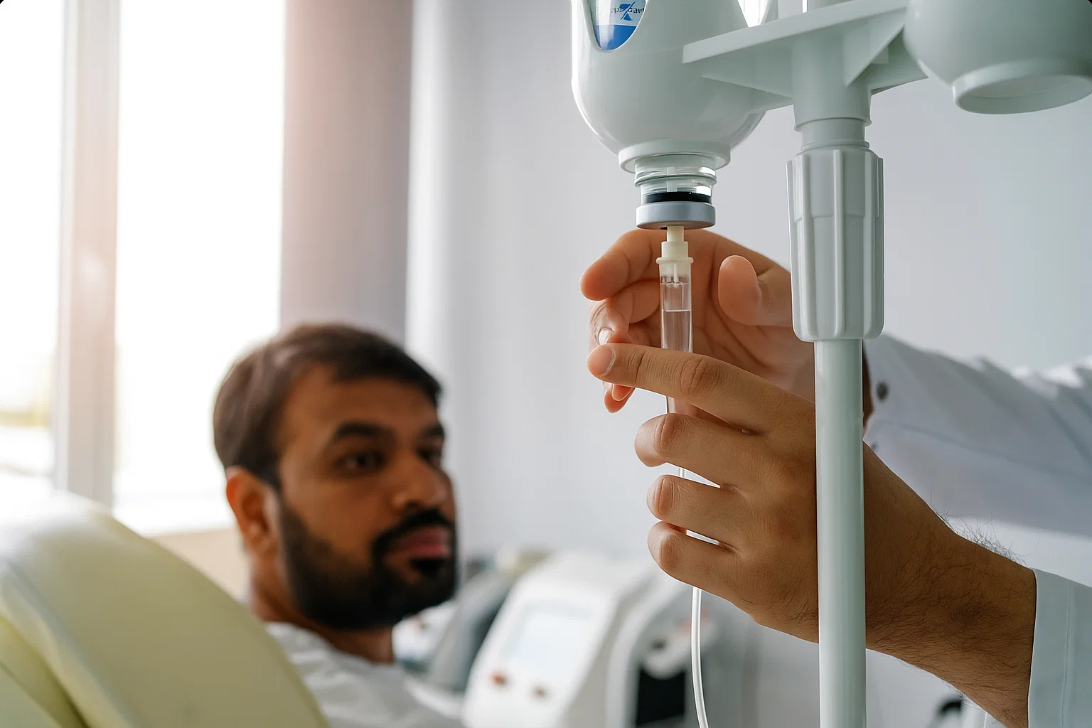 Professional setup and monitoring of IV fluids with complete sterilization practices.